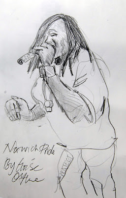 Norwich Pride is now in its 3rd year. The Norwich Pride is a festival open for everyone to join in who support LGBT people. It is family and disability friendly too. This year I was on the arts team, but became a lame duck in the middle of meetings due to a big ear operation. Part of the recovery was getting exhibitions together. I have a big solo show at Henry's cafe bar in Norwich. Also entered the portrait competition at St. Gregory's and for the next few weeks I am part of Pride without Prejudice show at St.Margaret's on St. Benedict's. Also at St. Margaret's I have some sketches of the Pride day on the wall of Pride. Which is a wall anyone can add there Pride pictures too. Since my ear operation my hearing has improved tremendously and I can hear music now. So it gave me great pleasure watching all the musical shows at Norwich Pride. These sketches are original live drawings that take a couple minutes to draw, they get very smudgy from carrying them around and getting ink, charcoal and pencil on my hands. They are all draw on white paper, the photo of the sketch makes the colour of paper change.